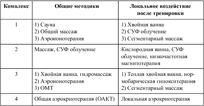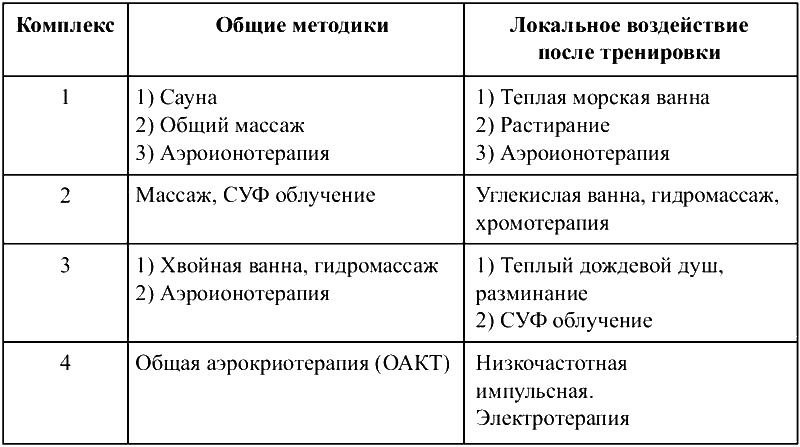 Выбор физиотерапевтических восстановительных методик, технология их комбинирования проводится индивидуально, исходя из работоспособности, функционального состояния, уровня здоровья и текущей физической загруженности спортсмена. Возможно использовать в программе восстановления 3–4 метода. При использовании нескольких методов следует пропорционально уменьшать интенсивность каждого из них.