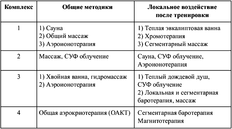 Комбинирование аэроионотерапии, СУФ-облучения, низкочастотной магнитотерапия (табл. 10) целесообразно из-за нагрузок анаэробного характера, где энергообеспечение происходит за счет расщепления гликогена в мышцах без участия кислорода. Предложенные комбинации активируют микроциркуляцию, улучшают транспорт кислорода к органам и тканям, повышают утилизацию кислорода тканями, активизируют эвакуацию углекислого газа и токсических продуктов жизнедеятельности клеток и задерживают время наступления ацидоза.