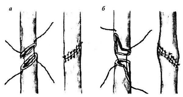 Рис. 8.13. Методики сшивания (а, б) мочеточника (анастомоз «конец в конец»)