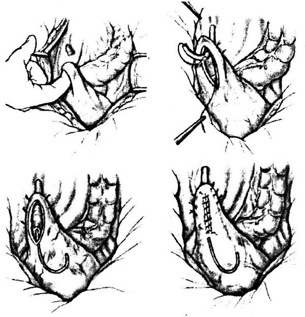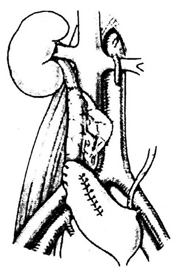 Выявленный в ходе операции поврежденный мочеточник после освежения его краев сшивается на катетере. К области мочеточниково–мочеточникового анастомоза внебрюшинно подводится дренажная трубка.