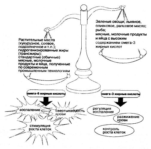 Начиная с пятидесятых годов потребность в молочных продуктах и говядине настолько возросла, что фермерам пришлось искать пути ускорения естественного цикла производства молока и уменьшать площади свободного выпаса, необходимые для прокорма 750-килограммовой коровы. С пастбищами пришлось распроститься: их заменили содержанием скота в стойлах. Кукуруза, соя и пшеница, которые стали основным рационом скота, практически не содержат омега-3 жирных кислот. И напротив, эти источники питания богаты омега-6 жирными кислотами. Омега-3 и омега-6 жирные кислоты называют «незаменимыми» потому, что человеческий организм не может сам их вырабатывать. В результате содержание омега-3 и омега-6 жирных кислот в наших организмах прямо зависит от состава нашей пищи. В свою очередь доля омега-3 и омега-6 жирных кислот в нашей пище зависит от того, что потребили со своей пищей ее «поставщики» — коровы, овцы, куры. Если они едят траву или зерно, то получаемые от них мясо, молоко и яйца идеально сбалансированы по омега-3 и омега-6 жирным кислотам (баланс близок к 1:1). Если же они питаются кукурузой и соей, то в результате дисбаланс в их, а затем и в наших организмах достигает 1:15 и даже 1:40 (51).