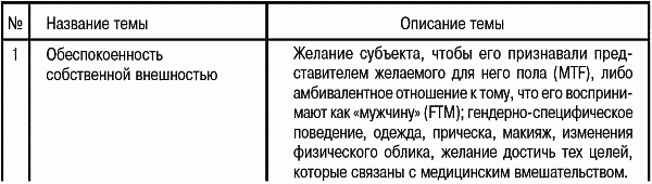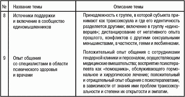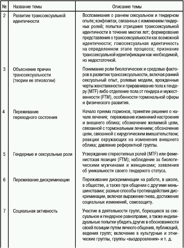В результате анализа текстов интервью были выделены девять основных тем (см. таблицу 2): (1) обеспокоенность собственной внешностью; (2) развитие транссексуальной идентичности; (3) объяснение причин транссексуальности (теории ее этиологии); (4) переживание переходного состояния; (5) гендерные и сексуальные роли; (6) переживание дискриминации; (7) социальная активность; (8) источники поддержки и включение в сообщество единомышленников; (9) опыт общения со специалистами в области психического здоровья и врачами (последняя тема затрагивалась в основном по инициативе с нашей стороны, поскольку мы рассчитывали таким образом получить информацию, которая была бы полезна для читателей данной статьи). Кроме того, мы обращали внимание на различия между MTF и FTM в обсуждении тем, что представлялось естественным, учитывая качественную разницу во взглядах и опыте этих двух групп транссексуалов.