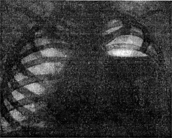Открытый пневмоторакс (рис. 17) возникает при широко зияющей ране грудной стенки, раскрывающейся в момент вдоха («сосущий пневмоторакс»). Во время ВОВ (1941–1945 гг.) открытый пневмоторакс был диагностирован у 30.9–33.2 % раненых с проникающими ранениями груди [Куприянов П. А., 1946]. При открытом пневмотораксе воздух во время дыхательных движений входит и выходит из плевральной полости. Открытый пневмоторакс сопровождается более значительными и опасными для жизни нарушениями дыхания и сердечной недостаточности, чем закрытый. В момент вдоха легкое на стороне ранения спадается и расправляется в момент выдоха, вызывая так называемое «парадоксальное дыхание». Непрерывные колебания средостения с жизненно важными органами далеко не безразличны для гомеостаза. При открытом пневмотораксе нарушается приток крови к правому сердцу, полым венам вследствие их сдавления. При спадении легкого затрудняется прохождение крови по малому кругу и, несмотря на компенсаторную тахикардию, снижается объем циркулирующей крови. Возникает сердечно-легочная недостаточность. Нарушаются функции обоих легких. Чем больше отверстие в грудной клетке при открытом пневмотораксе, тем он тяжелее протекает. Двусторонний открытый пневмоторакс практически всегда смертелен [Куприянов П. А., 1946].