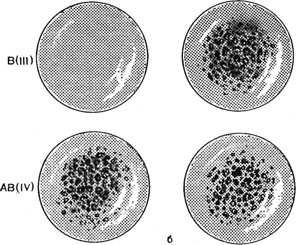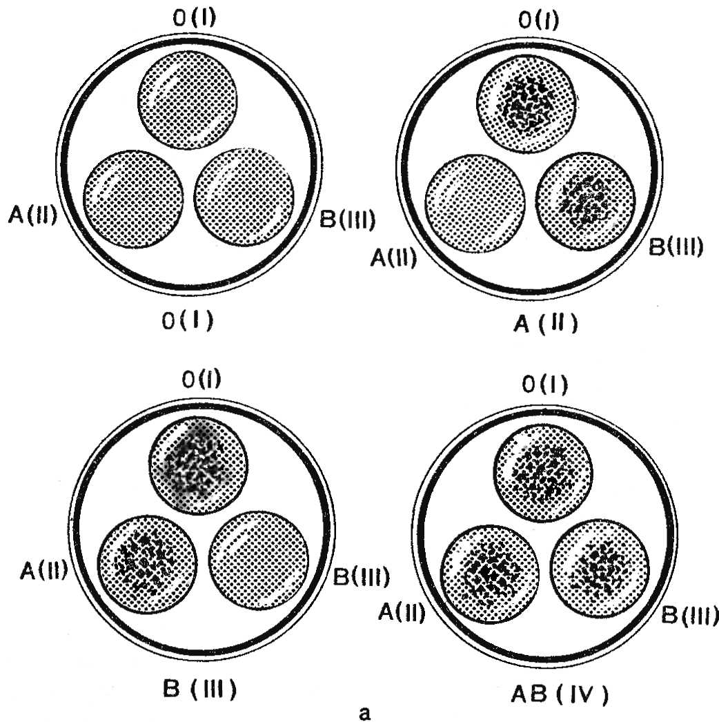 Кровь обследуемого из пальца стеклянной палочкой переносят в каплю сыворотки на тарелке и смешивают до равномерного окрашивания. В каждую сыворотку кровь переносят новой палочкой. Через 5 мин с момента окрашивания определяют группу крови. В сыворотке, где произошла агглютинация (склеивание эритроцитов), появляются хорошо видимые красные зернышки и глыбки; в сыворотке, где агглютинации нет, капля крови останется гомогенной, равномерно окрашенной в розовый цвет. При 0(I) группе крови склеивания эритроцитов нет ни в одной сыворотке. В случае А(II) группы крови агглютинации не будет с сывороткой группы А(II), а если обследуемый имеет В(III) группу, то агглютинации не будет с сывороткой В(III). Агглютинация наблюдается со всеми сыворотками при AB(IV) группе (рис. 53, а).