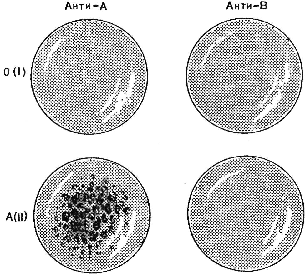 Реакция может быть положительной — склеивание эритроцитов в красные агрегаты или отрицательной, когда аггрегации нет и капля равномерно окрашена в красный цвет. Реакция обычно происходит в первые секунды. Оценка результатов представлена на рис. 53, б. Группа крови 0(I) — в обеих каплях реакция отрицательная; II группа А(II) — с анти-А реакция положительная, с анти-В отрицательная; III группа В(III) — с анти-А отрицательная, с анти-В положительная; IV группа AB(IV) — реакция положительная в обеих каплях.