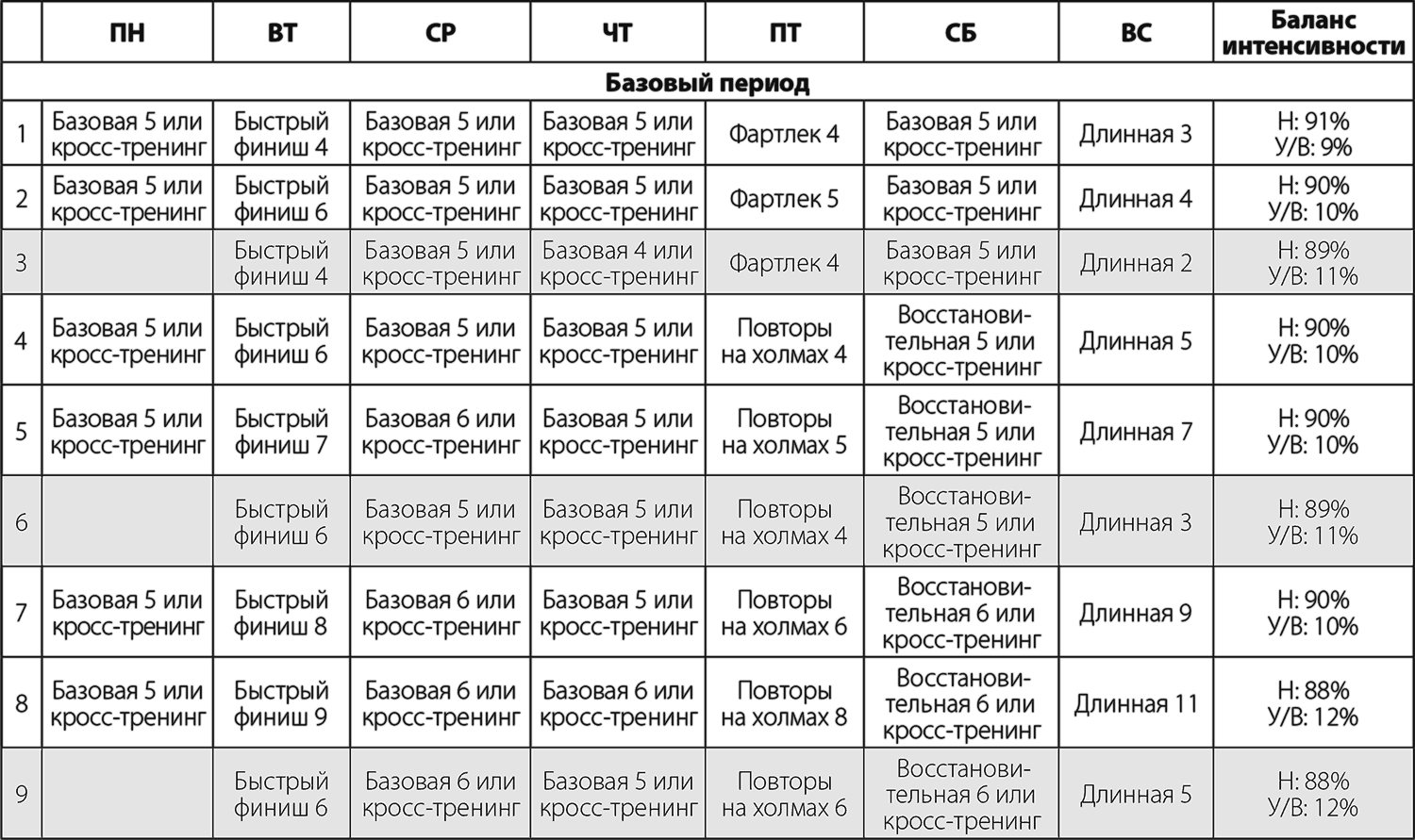 Этот план создан для бегунов, которые готовы увеличить свои тренировочные объемы, чтобы улучшить результат на марафоне. К началу этого плана вы должны бегать как минимум три раза в неделю, включая некоторые короткие отрезки со средней и высокой интенсивностью и легкие пробежки длиной не менее 8 миль [12,8 км], и делать аэробные упражнения семь раз в неделю. Тренировочный объем будет расти от 4 часов 52 минут в 1-ю неделю до 6 часов 56 минут в 13-ю неделю.
