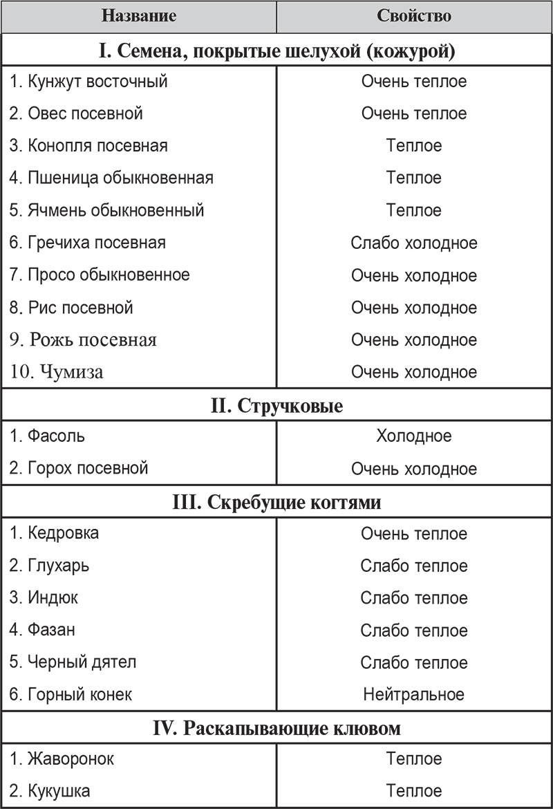 В табл. 1 приводятся сведения о теплых и холодных свойствах пищевых продуктов согласно классификации, которая принята в традиционной тибетской медицине. В табл. 2 дается оценка холодных и горячих свойств, нетрадиционных для Тибета продуктов питания. (Цитируются по работе – Г. Л. Ленхобоев, Н. Ц. Жамбалдагбаев «О теплых и холодных свойствах пищевых продуктов и лекарственных средств», препринт № 220, ВЦ СО АН СССР, Новосибирск, 1980 г.)