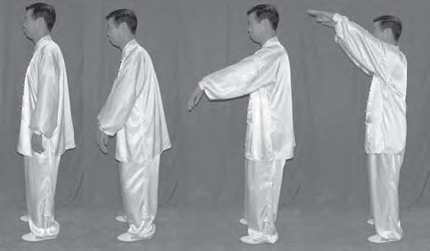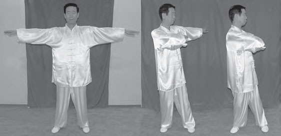 Нужно представлять, что энергия из неба движется вниз, проходит через ладони, руки, по передней части тела, по внутренней поверхности ног и через точки Юнь-Цюань опускается в землю.