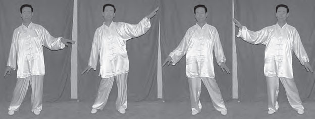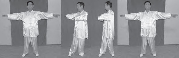 На начальных этапах обучения нужно представлять, что энергия из неба принимается через ладонь «верхней» руки и, проходя по задней части тела, выходит из ладони «нижней» руки. На более высоком уровне мастерства энергия, принимаемая через ладонь верхней руки, идет по задней стороне тела, но выходит не из ладони «нижней» руки, а проходит по телу более длинный путь и выпускается в землю через стопу разноименной ноги.