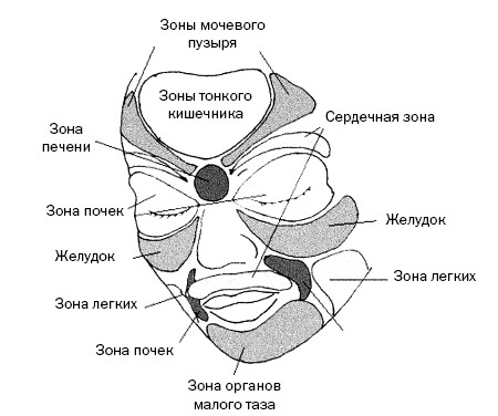 Вслед за восточными врачами и выдающимися русскими клиницистами пристально всмотримся в свое лицо. Подобно ладони и стопе, лицо зонируется на проекции внутренних органов и систем (см. рис. 48).