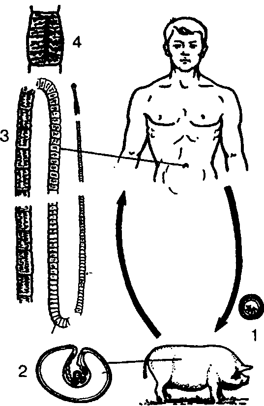 Жизненный цикл свиного цепня: 1 – яйцо; 2 г– личинка (финна) в мышцах свиньи; 3 – взрослый червь в кишечнике человека (человек заражается , съедая недожаренное мясо); 4 – зрелый членик с яйцами , выходящий наружу с экскрементами