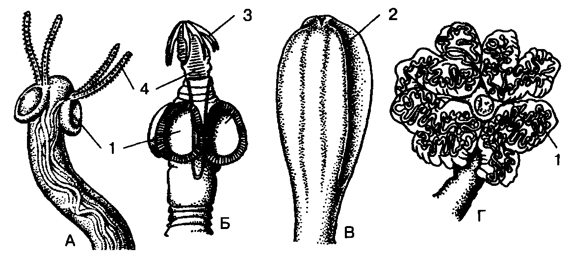 Сколексы цепней: А – тетраринхуса; Б – карликового; В – лентеца; Г – филлоботриума (паразита скатов). 1 – присоски; 2 – щели;3 – крючья; 4 – хоботки с крючьями