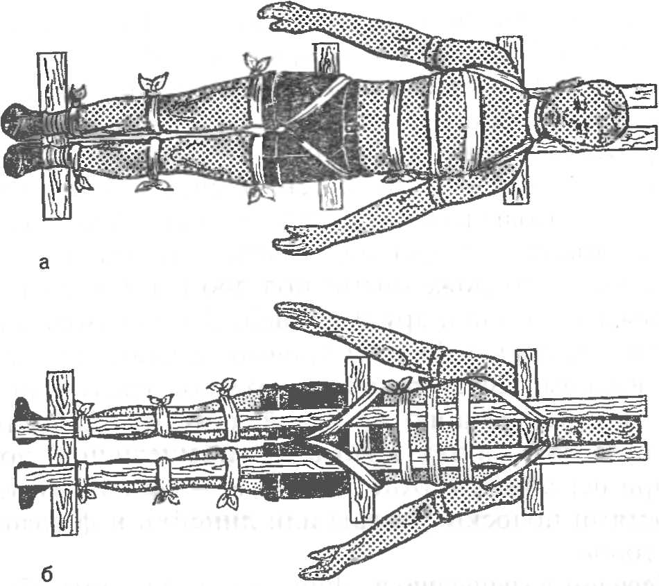 Рис. 58. Иммобилизация при переломе позвоночника, а — вид спереди; б — вид сзади.