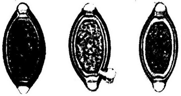 Яйца желтовато-коричневого цвета, по форме напоминают лимон или бочонок с бесцветными прозрачными пробками на полюсах. Оболочка гладкая, толстая, многослойная. Содержимое яйца мелкозернистое (рис. 6.12, см. рис. 6.3).