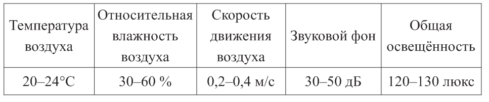 Рациональная организация рабочего места массажиста. Наиболее предпочтительным вариантом труда профессионального массажиста является работа в отдельном, специально оборудованном помещении, в котором поддерживаются оптимальные параметры температуры и качества воздуха, освещённости, акустического режима и других факторов окружающей среды (табл. 1). Чем меньше некомфортных внешних раздражителей действует на массажиста, тем дольше его организм будет поддерживать высокий уровень работоспособности.