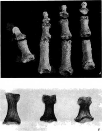 Рис. 52. А — проявления болезни Кашина — Бека у кочевника VIII–X вв., резко выраженные краевые костные разрастания в дистальных межфаланговых суставах; Б — рентгенограммы укороченных средних фаланг с отчетливыми проявлениями болезни Кашина — Бека (мужчина, погребение начала нашей эры).