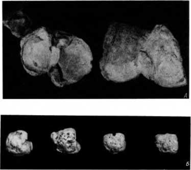 В предшествующих фазах можно обнаружить другую картину. Суставные концы (и метафизарные участки у растущих) характеризуются своеобразной деформацией на всей их поверхности или на части ее. Поверхность суставных концов отличается резко выраженной неровностью, большими или меньшими вдавлениями, как бы рвами, рытвинами (рис. 53, Б). Эти изменения производят впечатление очень тяжелого поражения. В действительности все не совсем так. В. А. Тихонов[89] на патологоанатомических препаратах умерших современных больных показал, что в этих случаях имеются компенсаторные изменения со стороны хрящевой ткани. Она утолщается вообще, но в особенности в местах, соответствующих вдавлениям, рвам, рытвинам в кости, которые заполняются хрящом. Таким образом выравнивается поврежденная суставная поверхность кости. Однако в дальнейшем происходит изнашивание этого хрящевого покрова и в конце концов может наступить полное или почти полное его исчезновение. Возникают деформирующие артрозы (рис. 52, А и Б; 53, А).