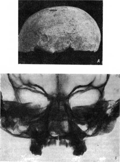На одном из черепов в лобной кости над левой надбровной дугой обнаруживается дефект, круглой формы, в виде ямки, с хорошо выраженным костным валом (рис. 99, А). На рентгенограмме виден поверхностный дефект кругловатой формы. Следов травматических изменений нет. Костный препарат и рентгеновская картина характерны для гуммы черепа.