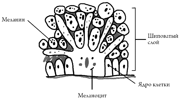 На каждые десять-двенадцать зародышевых клеток приходится по одному меланоциту. В цифрах это означает примерно от 900 до 1500 меланоцитов на квадратный миллиметр. На лице их даже до 2000, в области гениталий – до 2400, а на стопах и ладонях, наоборот, всего от 100 до 200 меланоцитов на квадратный миллиметр. Перчатка-меланоцит своими пальчиками передает крошечные пигментные шарики с красителем меланином дальше в клетки эпидермиса. Один-единственный меланоцит может накормить меланином от 30 до 40 кератиноцитов. Стоит появиться солнышку, как они начинают работать и окрашивают нашу кожу загаром.