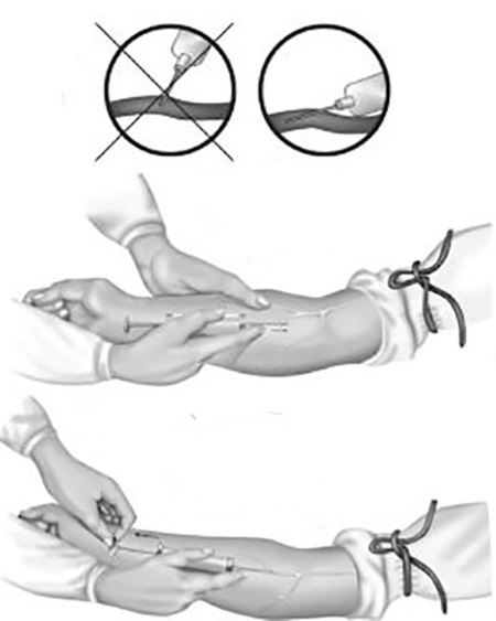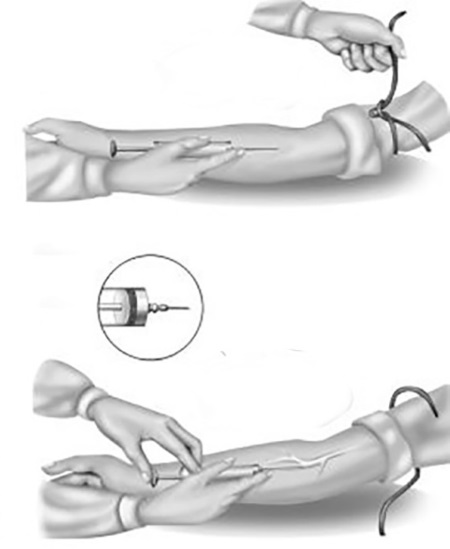 Рис. 13. Техника внутривенной инъекции: а) введение инъекционной иглы параллельно вене; б) контроль правильности венепункции; в) снятие венозного жгута; г) внутривенное введение лекарства