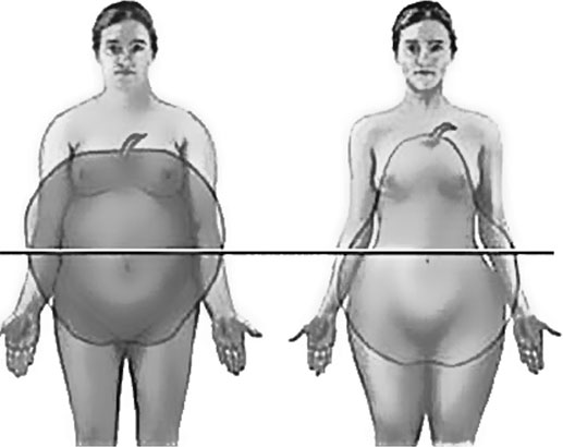 Если же тип «яблоко» имеет сочетание высокой груди и отека солнечного сплетения, то это опять же станет показателем некорректного дыхания – слабости как диафрагмального выдоха, который не может подтянуть диафрагму, так и диафрагмального вдоха, неспособного сбросить лишнюю жидкость вниз.