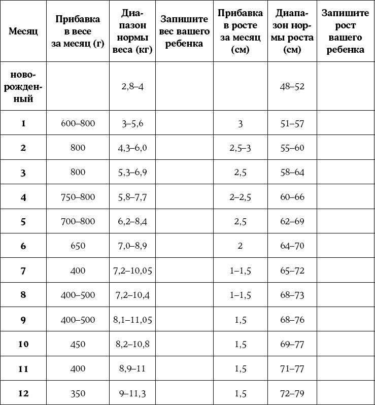 2. Таблица примерных прибавок веса и роста ребенка до 1 года