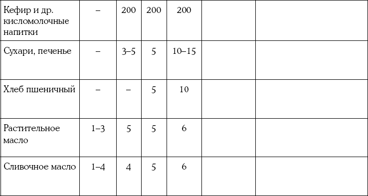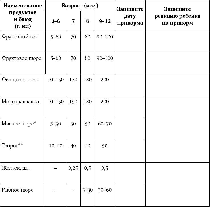 7. Примерная схема введения прикорма детям первого года жизни (Национальная программа оптимизации вскармливания детей первого года жизни в РФ, 2010 г.)