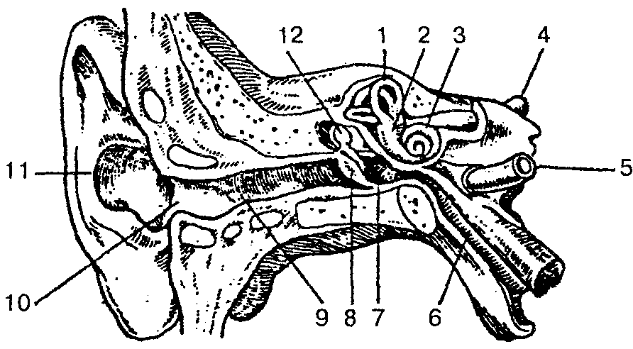 1— верхний полукружный канал; 2— преддверие; 3 — улитка; 4— слуховой нерв; 5 — сонная артерия; 6 — слуховая труба; 7— барабанная полость; 8— барабанная перепонка; 9— наружный слуховой проход; 10— наружное слуховое отверстие; 11 — ушная раковина; 12— молоточек