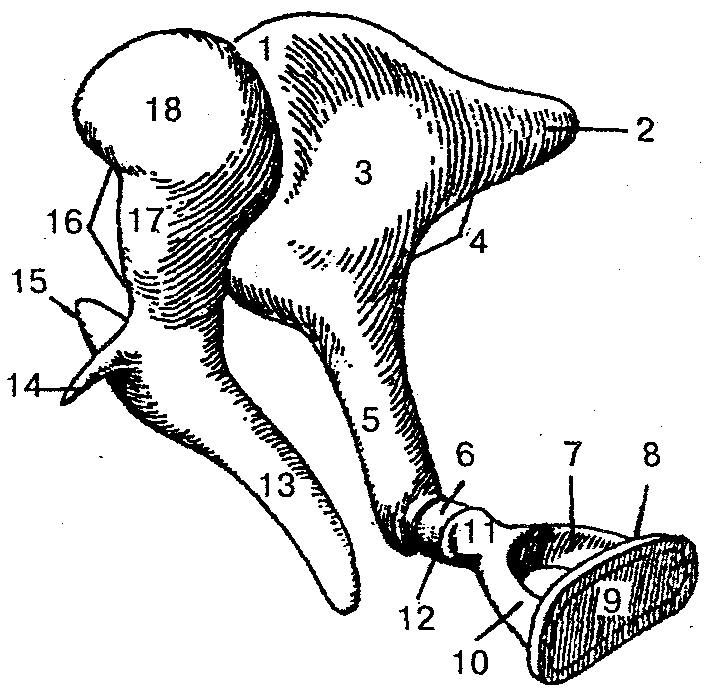 1 — наковальне-молоточковый сустав; 2 — короткая ножка наковальни; 3 — тело наковальни; 4— наковальня; 5 — длинная ножка наковальни; б— чечевицеоб-разный отросток; 7— задняя ножка стремени; 8 — стремя; 9— основание стремени; 10 — передняя ножка стремени; 11— головка стремени; 12 — наковальне-стременной сустав; 13 — рукоятка молоточка; 14 — передний отросток молоточка; 15 — латеральный отросток молоточка; 16 — молоточек; 17— шейка молоточка; 18— головка молоточка