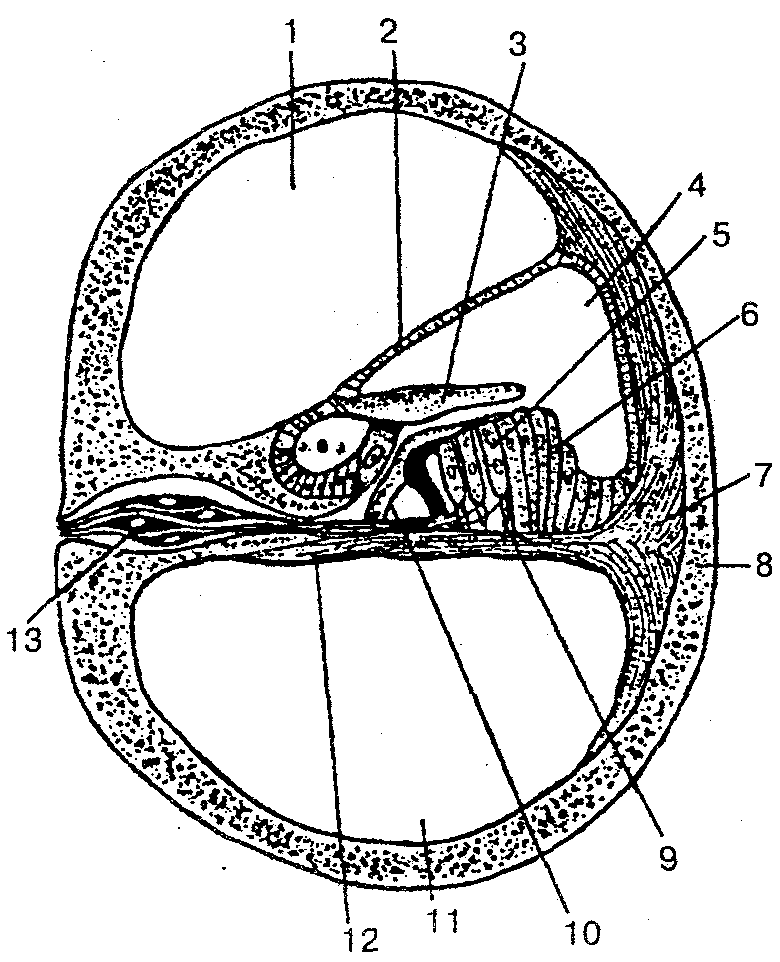 1 — лестница преддверия; 2— преддверная стенка улиткового протока; 3— покровная мембрана; 4 — улитковый проток; 5 — слуховые клетки с ресничками; 6—опорные клетки; 7— спиральный гребень (спиральная связка); 8— костная ткань улитки; 9 — опорная клетка; 10— кортиевы клетки-столбы; 11 — барабанная лестница; 12— базилярная пластинка; 13— нервные клетки спирального узла .