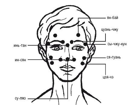 СЫ-ЧЖУ-КУН – у наружного края брови. ЦЗЯ-ЧЭ – кпереди и книзу от мочки уха, во впадине.