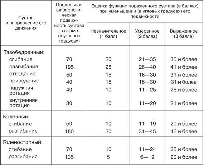 Данные, представленные в таблице, характеризуют ограничение подвижности в пораженном суставе. Эти показатели позволяют объективно оценить ущерб, наносимый патологическим процессом пораженному суставу, и произвести балльную оценку степени его выраженности.