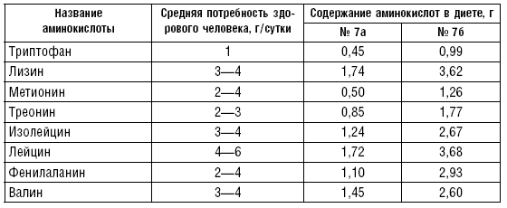 На основе созданных безбелковых продуктов в Институте питания РАМН разработаны 2 варианта малобелковой диеты, содержащей 20 г белков (диета № 7а) и 40 г белков (диета № 7б), на 75 % представленных белками животного происхождения (мясо, рыба, яйца, молоко) как наиболее сбалансированными по содержанию незаменимых аминокислот. Тем не менее крайне низкий абсолютный уровень белков в диете № 7а не позволяет обеспечить организм достаточным количеством незаменимых аминокислот, и поэтому ее назначают лишь на некоторое время (15–18 дней). Диета № 7б по содержанию незаменимых аминокислот соответствует суточной потребности для поддержания азотистого равновесия в организме взрослого человека (табл. 99).