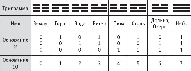 Насколько все это работает, можно судить хотя бы по тому, что двоичная система, заложенная в основу современных компьютеров, была разработана Лейбницем после изучения знаменитой «Книги перемен» (И-Цзин) [26]. Великий математик разглядел в начертаниях триграмм прежденебесного Ба-Гуа арифметическое счисление всего с двумя цифрами. Он усмотрел в этом свидетельство высшей гармонии и предположил, что книга И-Цзин позволяет моделировать разумное на основе ее линий и начертаний (этот же факт был отмечен в книге Хаупта об И-Цзин, вышедшей в 1753 г.).
