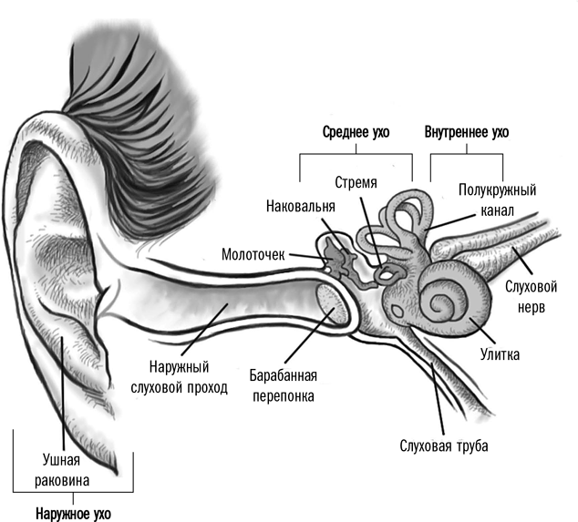 • Среднее ухо расположено сразу за барабанной перепонкой. Когда барабанная перепонка колеблется звуковой волной, слуховые косточки переносят звуковые колебания во внутреннее ухо. Слуховая (евстахиева) труба позволяет жидкостям из внутреннего и среднего уха попасть в носоглотку, где их можно проглотить. Если не считать этого сообщения с носоглоткой, область среднего и внутреннего уха полностью закрыта (разве только разорвется барабанная перепонка). Слуховая труба не только обеспечивает отток жидкости, но и выравнивает давление воздуха, чтобы внутри и снаружи барабанной перепонки оно было одинаковым. Если ее проходимость нарушена из-за воспаления, отека или инфекции, воздушное давление начнет усиливаться, а жидкость будет накапливаться, что может привести к ухудшению слуха и создать дискомфорт. Если жидкости будет слишком много или давление воздуха станет слишком сильным, барабанная перепонка может разорваться, чтобы обеспечить им выход. Иногда разрыв барабанной перепонки болезнен, но зачастую как раз наоборот, поскольку снимает давление. Как бы то ни было, если слуховая труба снова начнет функционировать, барабанная перепонка обычно со временем заживает.