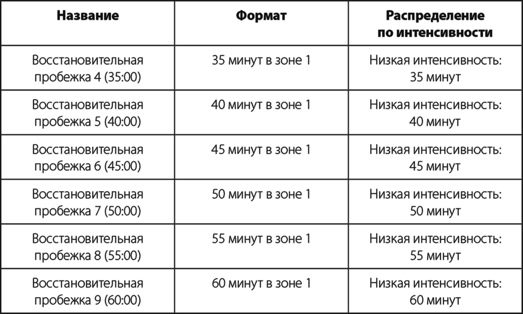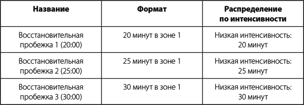 Восстановительная пробежка проходит целиком в зоне 1. Такие тренировки должны выполняться после очень тяжелых. Часто они выступают в качестве альтернативы полному дню отдыха, увеличивая общий беговой объем в «мягкой форме», не мешая восстановлению от тяжелой тренировки, проведенной накануне.