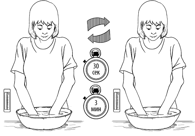 Хорошее профилактическое средство для периферических сосудов рук и ног – контрастные ванночки. Возьмите две широкие миски. В одну из них налейте теплую воду, нагретую до 38–39 °C. В другую налейте прохладную воду с температурой 20–22 °C. Сначала кисти обеих рук погрузите в теплую воду на 3 минуты, затем в прохладную на 30 секунд. Повторите процедуру 5–6 раз, завершив ее погружением кистей в холодную воду. Контролируйте температуру воды – добавляйте во время проведения процедуры горячую и холодную воду для поддержания температуры.