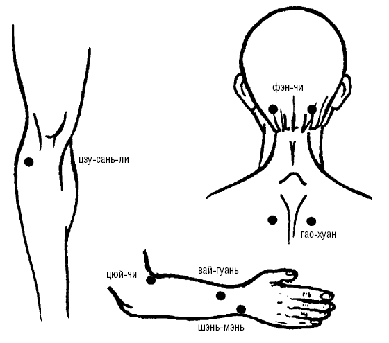 В связи с этим точечный массаж дифференцируется по методике выполнения. При гиперстенических состояниях применяется техника тормозная, седативная, успокаивающая. При гипостенических синдромах – наоборот, стимулирующая, тонизирующая, возбуждающая. Точки в рецепте лечения практически одни и те же (рис. 96).