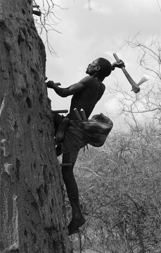 Рис. 20. Мужчина из племени Хадза лезет на дерево, чтобы достать пчелиные соты. Обратите внимание на деревянные колышки, которые торчат из ствола дерева. Мужчина стоит на них. Фото Брайана Вуда.