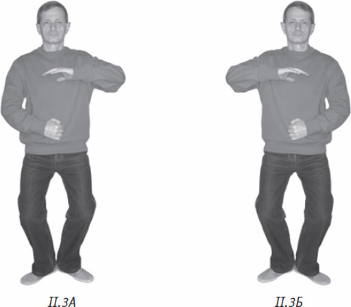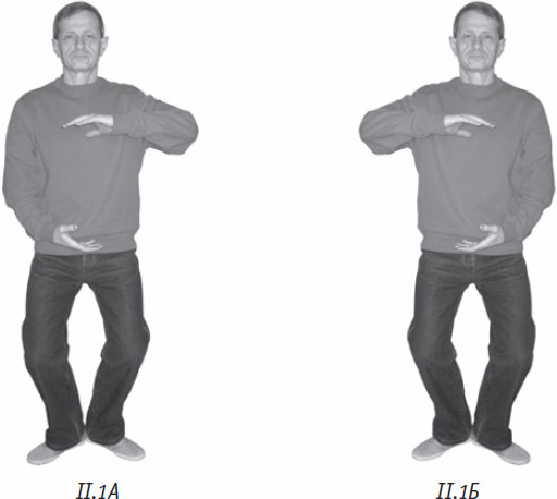 Положение рук, как в столбе I.1. Обе руки вращаются одновременно в профильной плоскости (если смотреть сбоку, ладони описывают эллипс). Вначале вращение происходит «от себя», потом «к себе».
