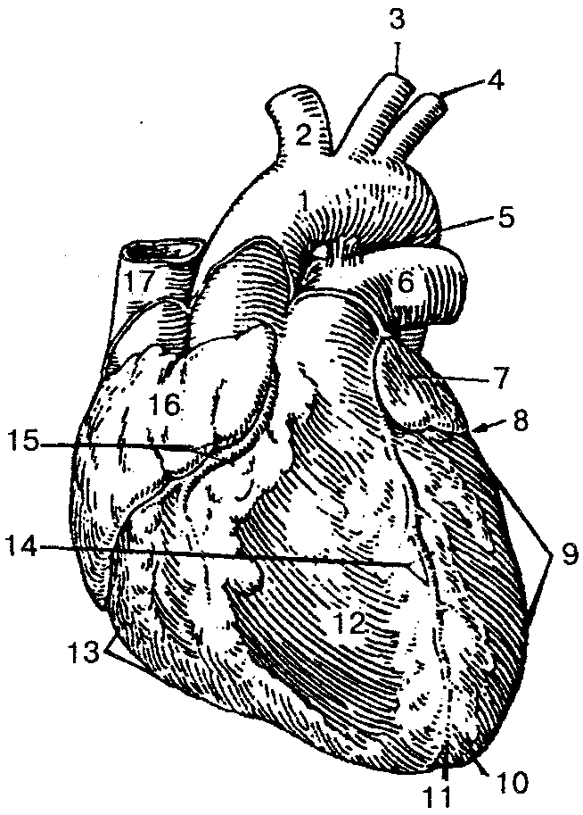 1 — аорта; 2 — плечеголовной ствол; 3 — левая общая сонная артерия; 4— левая подключичная артерия; 5— артериальная связка (фиброзный тяж на месте заросшего артериального протока); 6— легочный ствол; 7 — левое ушко; 8, 15 — венечная борозда; 9 — левый желудочек; 10— верхушка сердца; 11— вырезка верхуш-ки сердца; 12— грудино-ре-берная (передняя) поверхность сердца; 13 — правый желудочек; 14 — передняя межжелудочковая борозда; 16— правое ушко; 17— верхняя полая вена