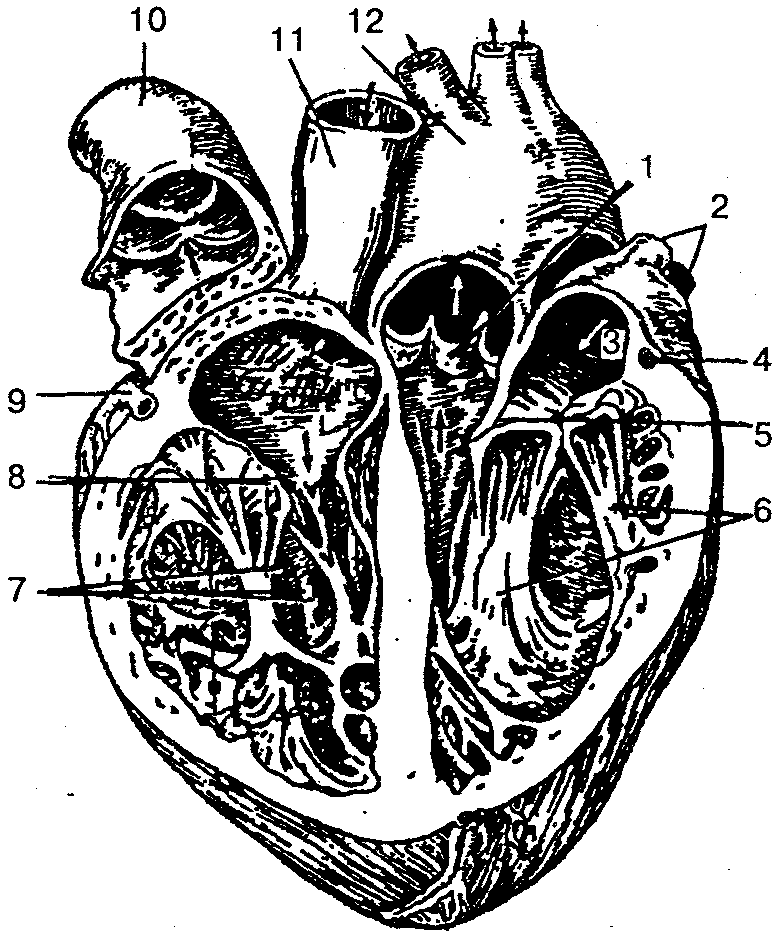1 — полулунные заслонки клапана аорты; 2 — легочные вены; 3 — левое предсердие; 4, 9— венечные артерии; 5 — левый предсердно-желудочковый (мит-ральный) клапан (двухстворчатый клапан); 6— сосочковые мышцы; 7— правый желудочек; 8 — правый предсердно-желудочковый (трехстворчатый) клапан; 10 — легочный ствол; 11— верхняя полая вена; 12— аорта