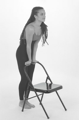 Адаптированный вариант Маюрасаны. Станьте напротив кухонного стола (как можно ближе к нему, почти касаясь его). Можно использовать также письменный стол, стул или любой другой предмет такой же высоты. Ноги должны быть раздвинуты, но так, чтобы вам было удобно. Ладони направлены от вашего тела, пальцы вниз. Немного наклонитесь вперед, чтобы ладони уперлись в край стула. По мере дальнейшего наклона вперед упритесь локтями в область под нижними ребрами так, чтобы ваше тело поддерживали теперь предплечья, но не переносите на них весь свой вес. Ноги принимают на себя все меньше веса, по мере того как вы наклоняетесь вперед и пятки начинают слегка приподниматься от пола. Расслабьте живот. Считайте, что выполняете эту позу правильно, если чувствуете напряжение или тупую боль в нижней части спины. Мышцы живота следует поддерживать в расслабленном состоянии. Локти не должны двигаться. Дышите спокойно. Оставайтесь в этой позе 10–15 секунд.