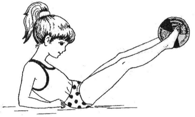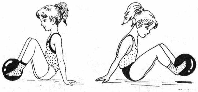 Сесть на пол, ноги согнуты, руками опираться сзади (рис. 92). Захватив мяч стопами, приподнять его и переложить его подальше от себя (рис. 93), выпрямляя ноги.