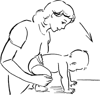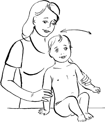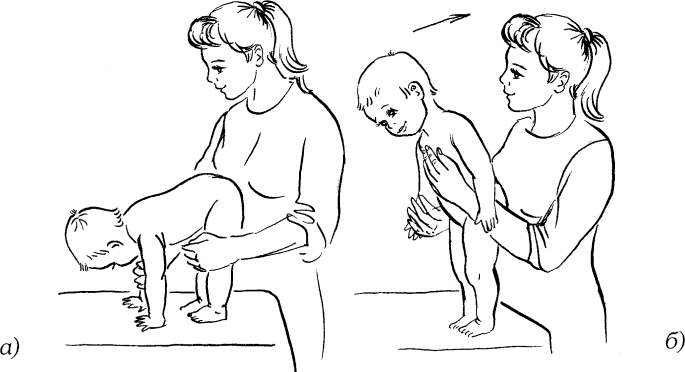 Затем снимите руку с предплечья, после чего ребенок должен выпрямить спинку, возвращаясь в вертикальное положение. Свободную руку вы кладете ему руку на грудь и помогаете подниматься вверх (рис. 395б).