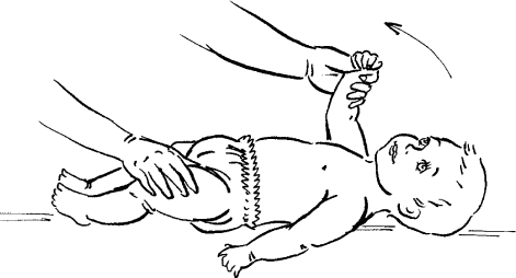 Исходное положение ребенка – лежа на спине, дайте ему захватить правой ручкой ваш большой палец правой руки, левой рукой вы удерживаете его за бедра (рис. 389).