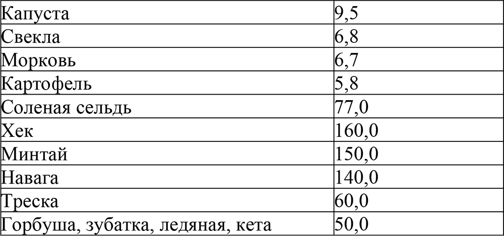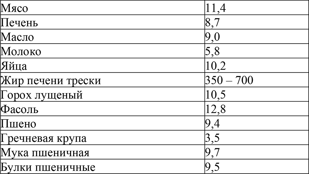 В привычных пищевых продуктах этот микроэлемент содержится в следующих количествах (в мкг на 100 г сырого продукта):