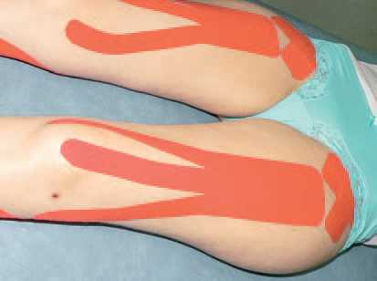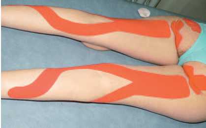 Техника тейпирования: 1) послабляющая коррекция с натяжением тейпов 35 % на область основания бедренного треугольника и точек выхода седалищного нерва с двух сторон; 2) стимуляционный тейпинг согласно анатомическому ходу бедренного и седалищного нервов с соблюдением основных точек разветвления нервных стволов разветвления.