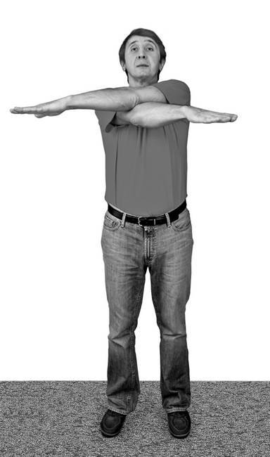 На счет «раз» скрестите прямые руки перед собой на уровне груди до отказа – вдох. Верните прямые руки в исходное положение – выдох. Воздух уходит самостоятельно, без нашей помощи, «растворяется». На вдохе снова скрестите руки и на выдохе верните в исходное положение. Возвращая руки в исходное положение, при желании можно продвинуть их дальше назад так, чтобы свести лопатки (грудь при этом слегка выдвигается вперед).