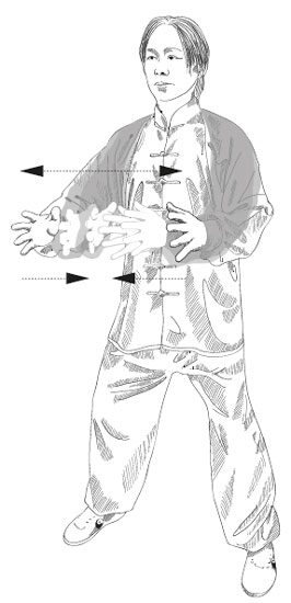 1. Описание движения: принять стойку «Столбовое стояние» (Движение 1). Руки согнуты в локтях, ладони раскрыты друг напротив друга на уровне живота. Необходимо медленно сводить и разводить кисти рук, не соединяя ладони.